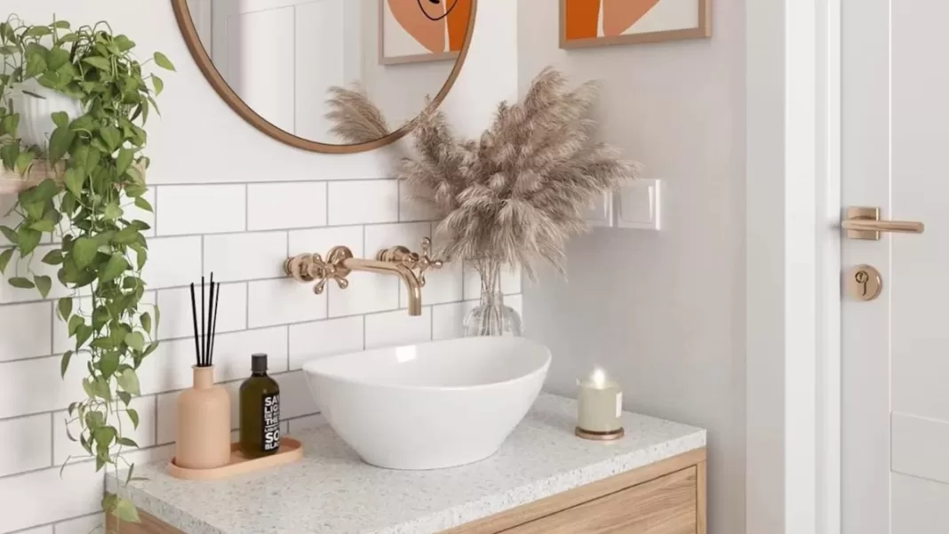 Escolha poucos objetos, mas com intenção: um dispenser bonito, uma bandeja pequena ou um quadro simples já são suficientes para dar personalidade sem sobrecarregar o espaço.