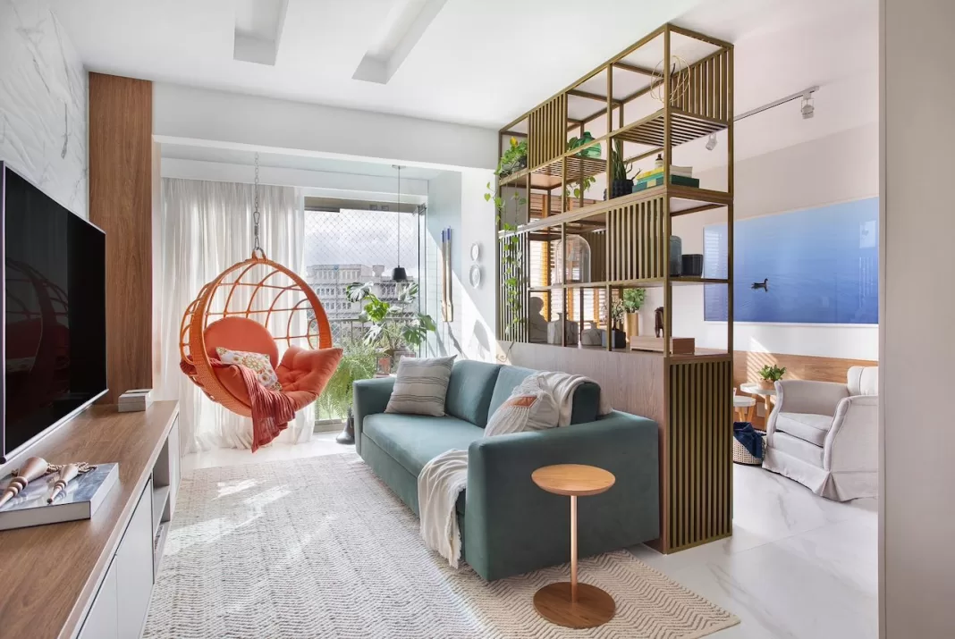 Diferente de paredes ou painéis fechados, ela delimita os espaços sem isolar completamente, mantendo a sensação de integração.