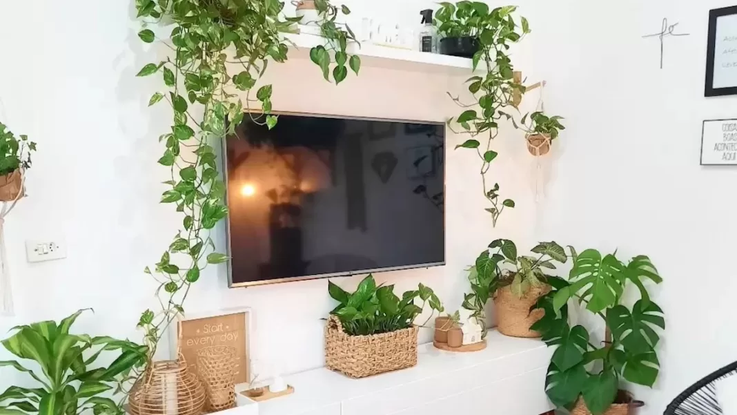 Se você tem ambientes integrados, use uma estrutura com vasos de jiboia como divisória viva. Ela traz privacidade e ajuda a renovar o ar do espaço.