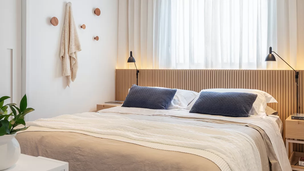 Uma cabeceira de lambri combinada com persiana em tom de madeira cria aconchego e textura ao ambiente.