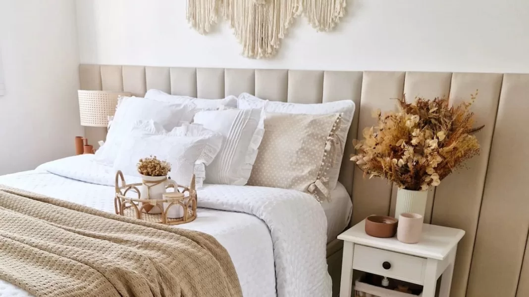 Use tinta para desenhar uma cabeceira geométrica ou orgânica. É barato, ocupa zero espaço e deixa o ambiente cheio de personalidade.