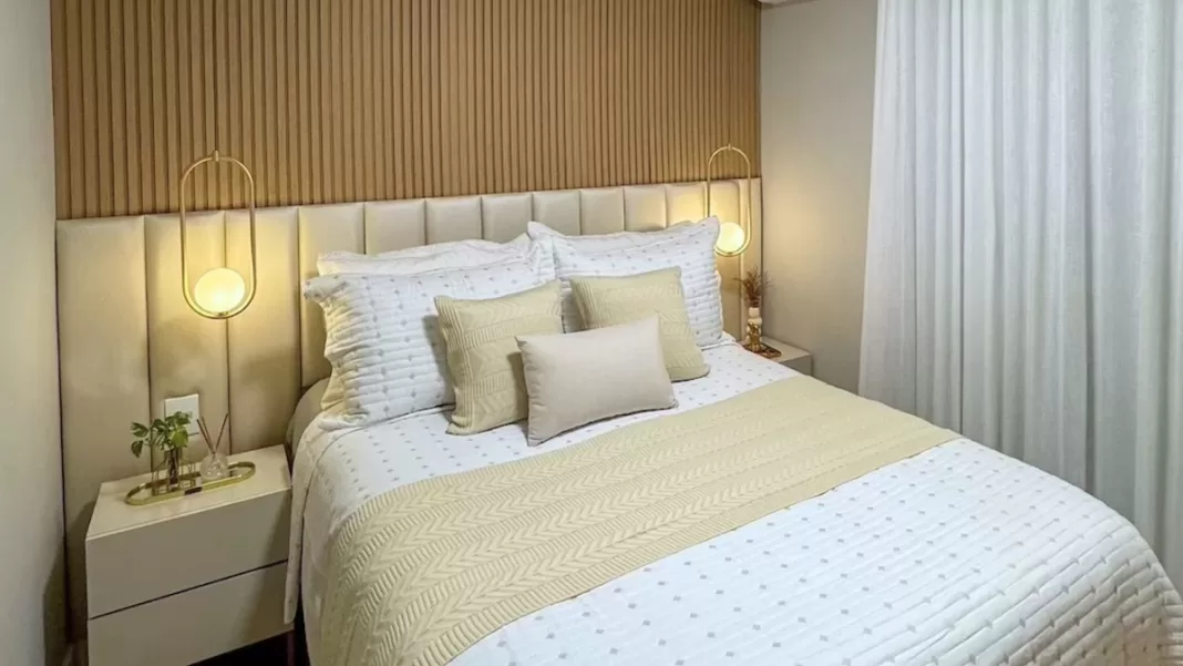 Mesmo em quartos pequenos, a cabeceira pode contribuir para o aconchego do ambiente. Modelos mais simples, como painéis de madeira, cabeceiras estofadas finas ou até soluções pintadas diretamente na parede, ajudam a compor o espaço sem pesar visualmente.