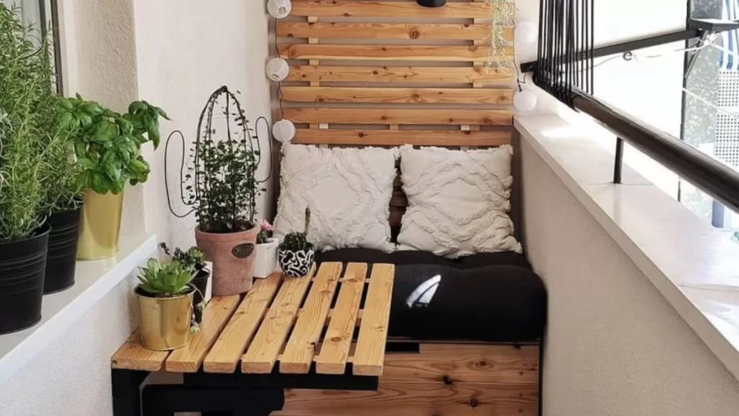 Aproveitar a parede é essencial em sacadas pequenas. É possível colocar plantas, livros ou objetos decorativos sem comprometer o espaço útil.
