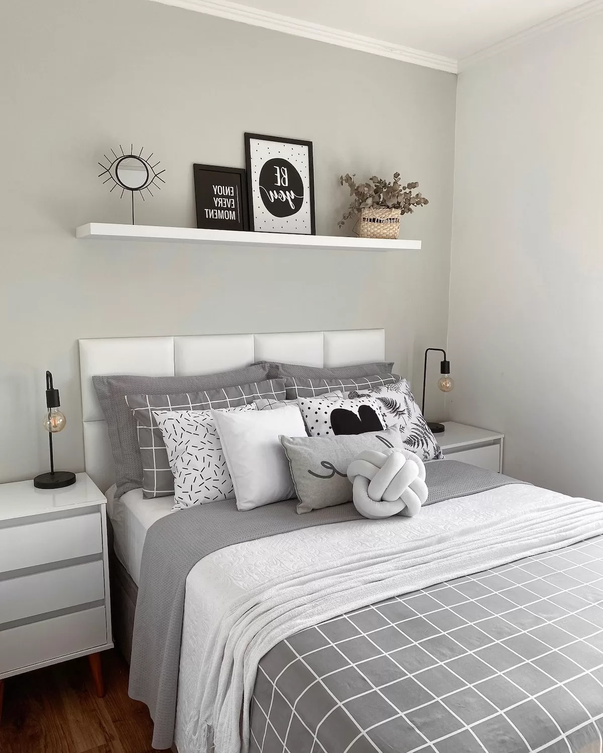 Cores neutras, cabeceira acolchoada e uma linda composição na roupa de cama.