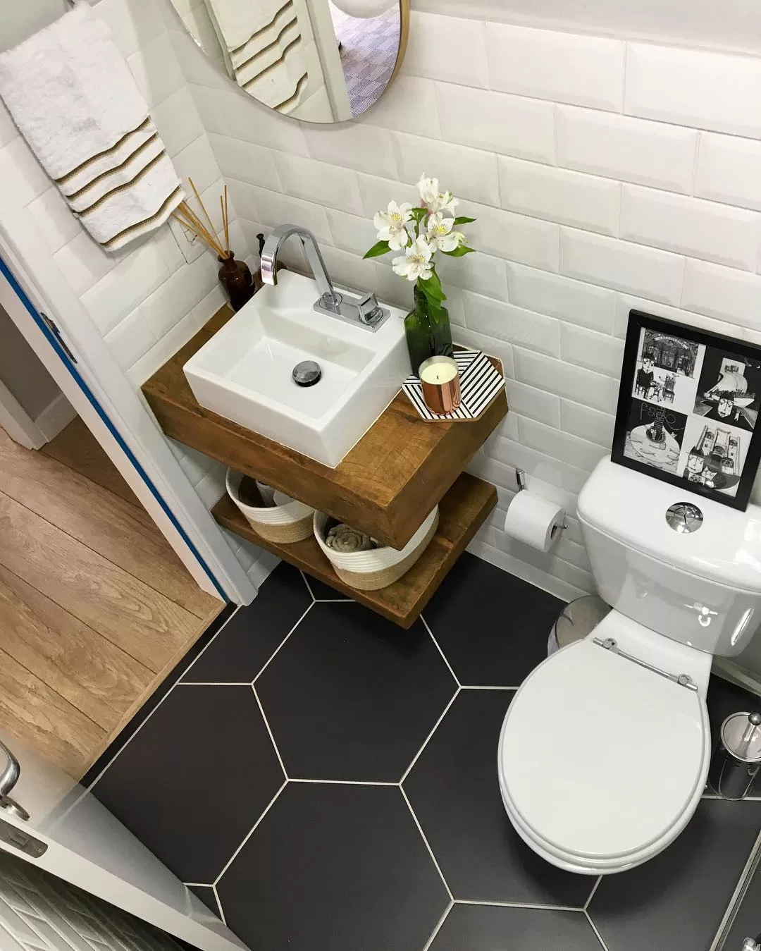 Banheiro pequeno com linda bancada de madeira e azulejo preto em forma geométrica