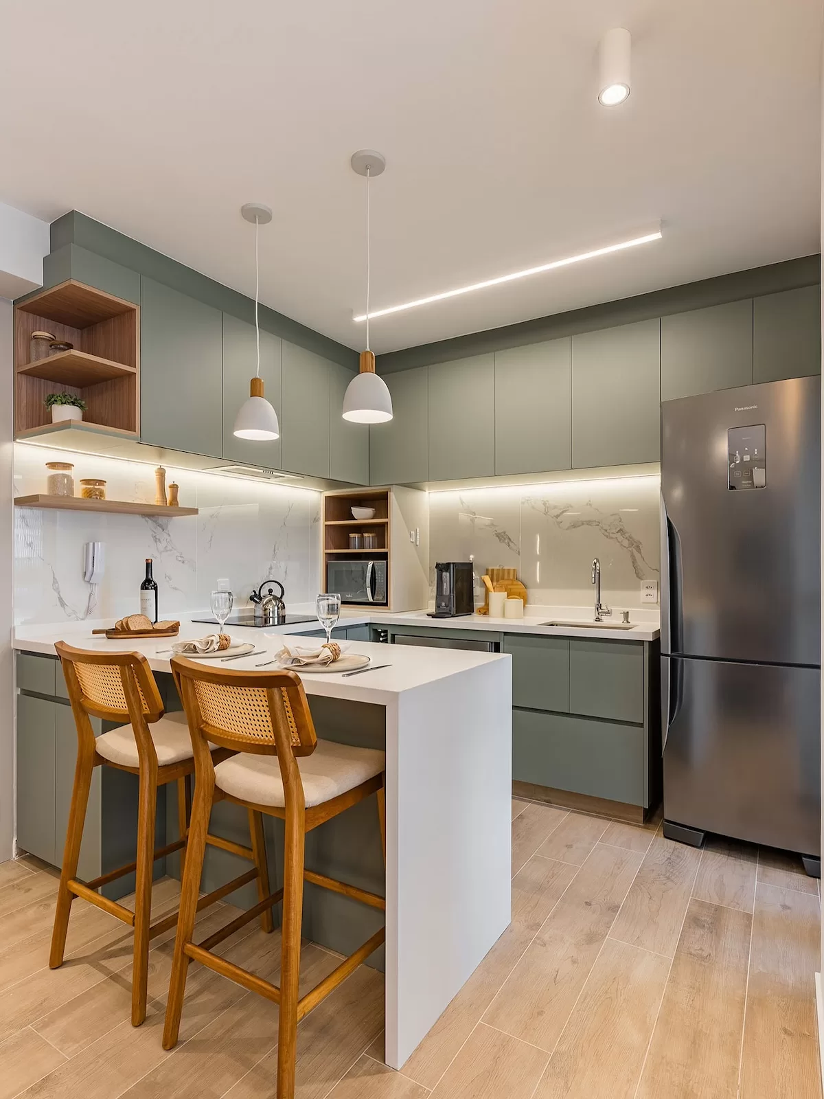 Na cozinha, a marcenaria em MDF verde e a bancada em U trazem cor suave, espaço para refeições rápidas e muito estilo.
