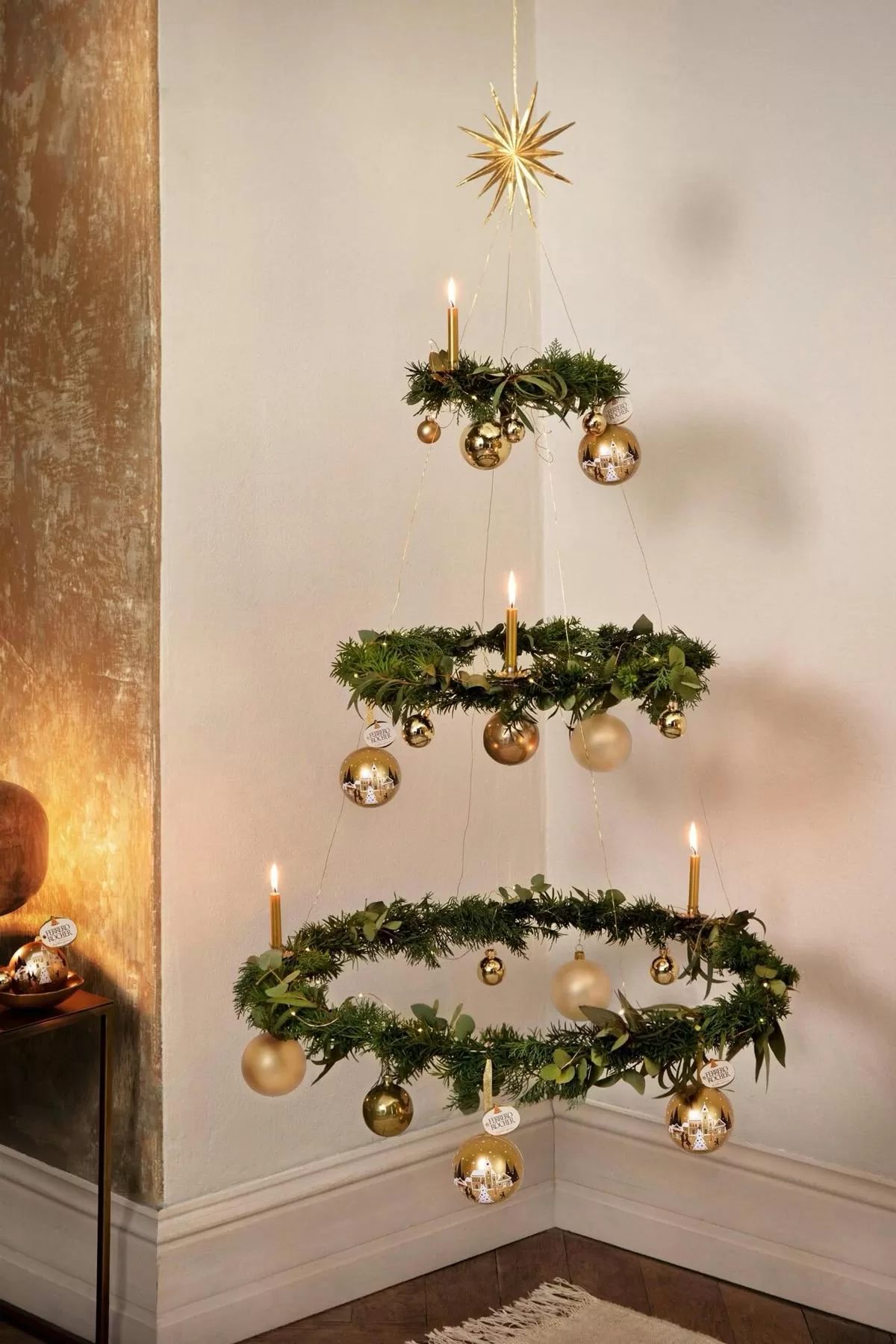 Monte o formato da árvore com festão na parede e finalize com luzes e enfeites decorativos.