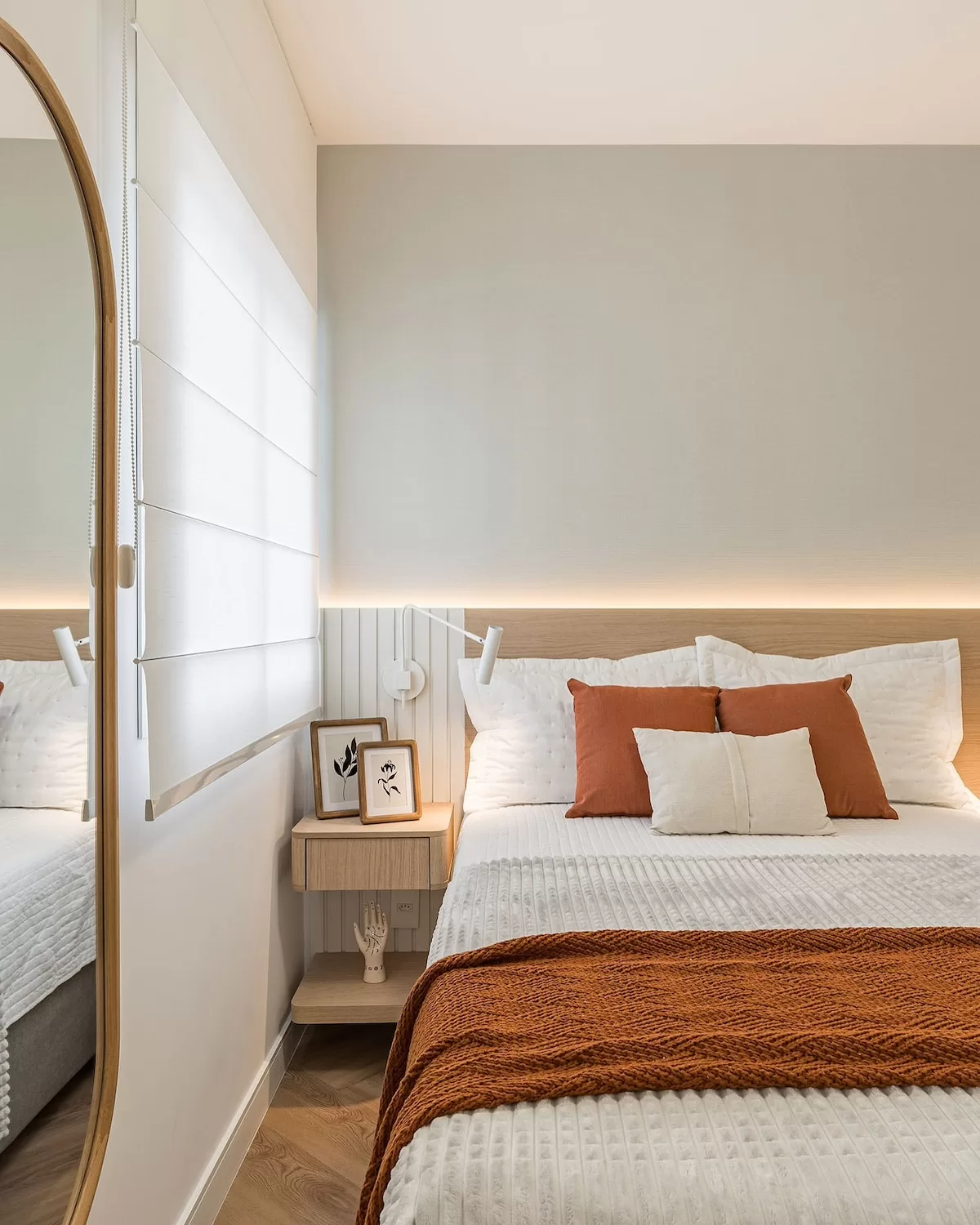 A parede setorizada em terracota é combinada com móveis brancos e texturas naturais.