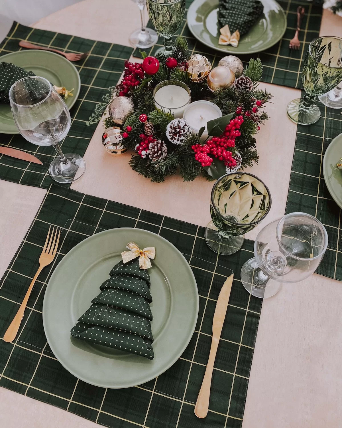 Surpreenda os convidados com guardanapos dobrados em forma de árvore de Natal.